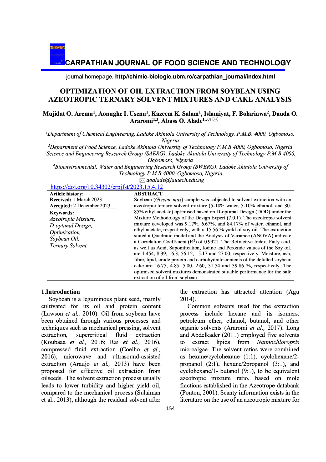Optimization of oil extraction from soybean using azeotropic ternary solvent mixtures and cake analysis