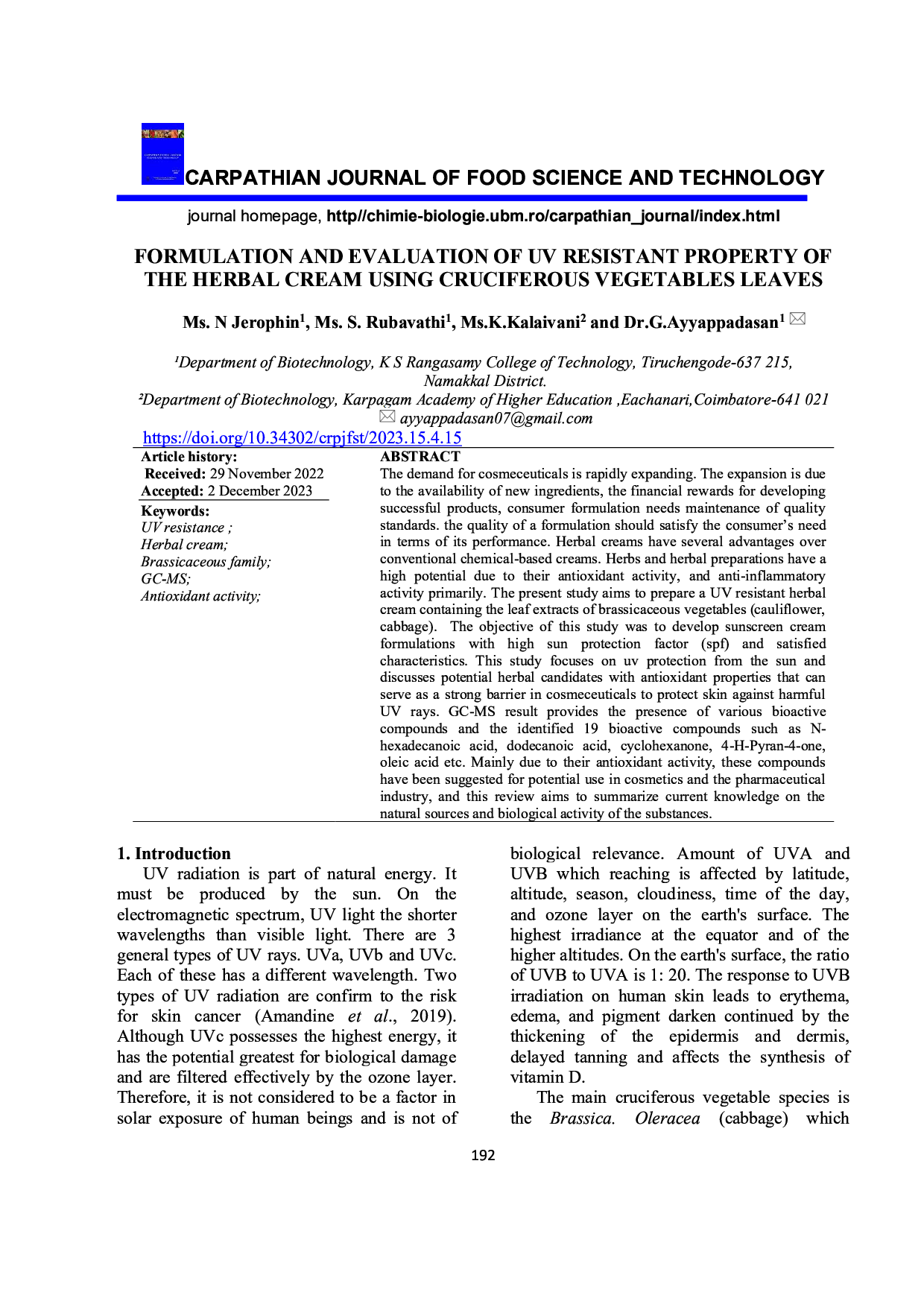 Formulation and evaluation of uv resistant property of the herbal cream using cruciferous vegetables leaves