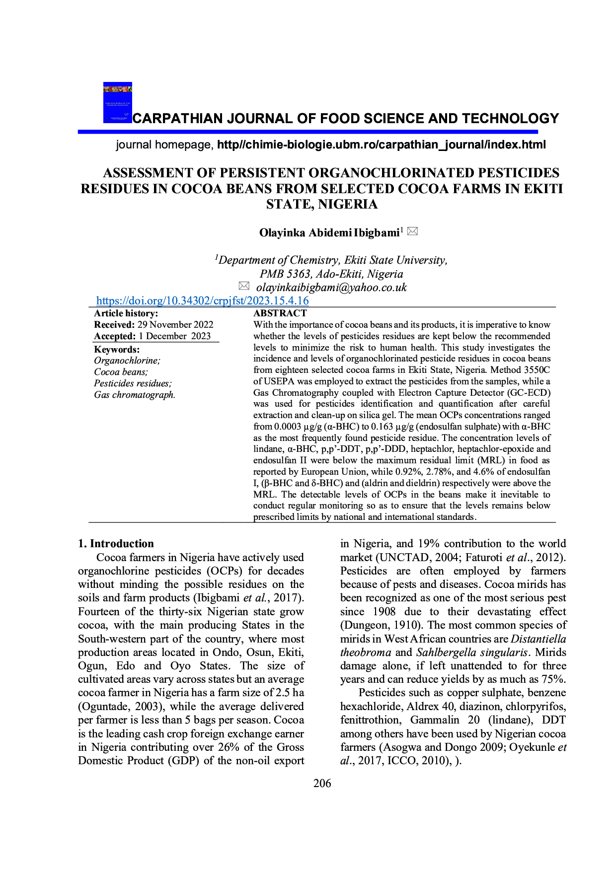 Assessment of persistent organochlorinated pesticides residues in cocoa beans from selected cocoa farms in Ekiti State, Nigeria